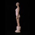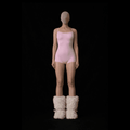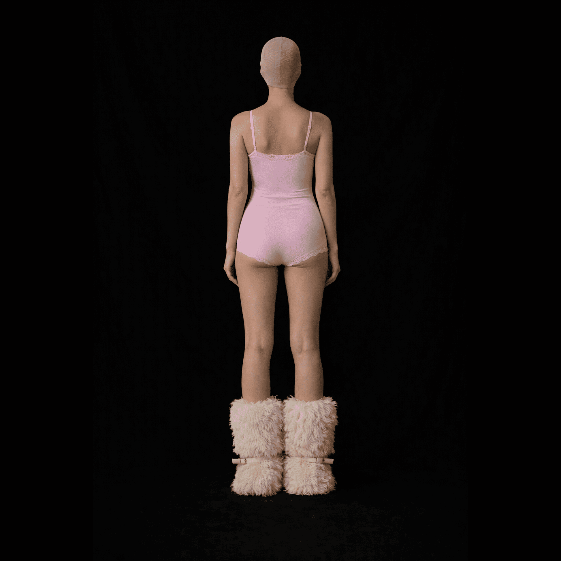 Jednoczęściowy, dopasowany body w pudrowym różu podkreśla sylwetkę i nadaje jej smukły, rzeźbiarski kształt. Subtelna koronka przy dekolcie i nogawkach dodaje miękkości oraz sensualnego akcentu.